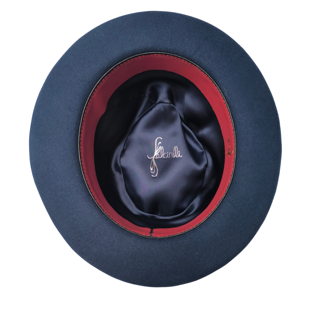 El fieltro, en 100% pelo de lapin, está trabajado de manera artesanal en nuestro taller en Madrid, se añade dentro un forro en satín serigrafiado y la badana en piel natural.