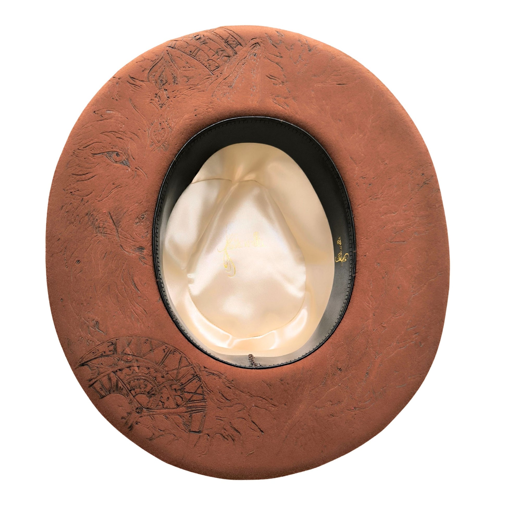 Un manifiesto de tu identidad, hecho sombrero. Copa fedora, ala plana con borde ligeramente levantado, doble cinta en piel y un grabado impresionante en la parte inferior del ala.  Disfruta de esta pieza espectacular, creada en nuestro taller de Madrid con muchas horas de diseño y grabado.
