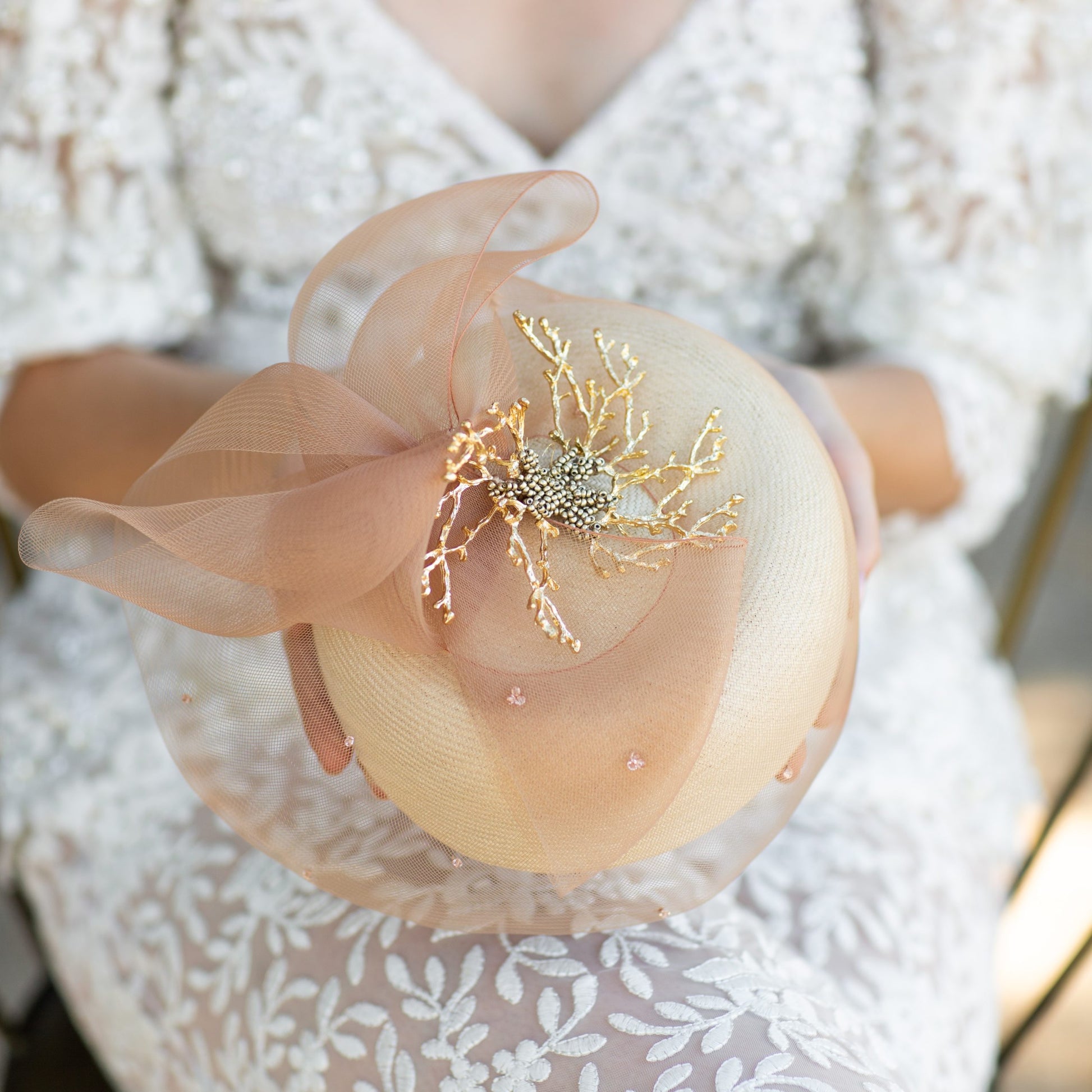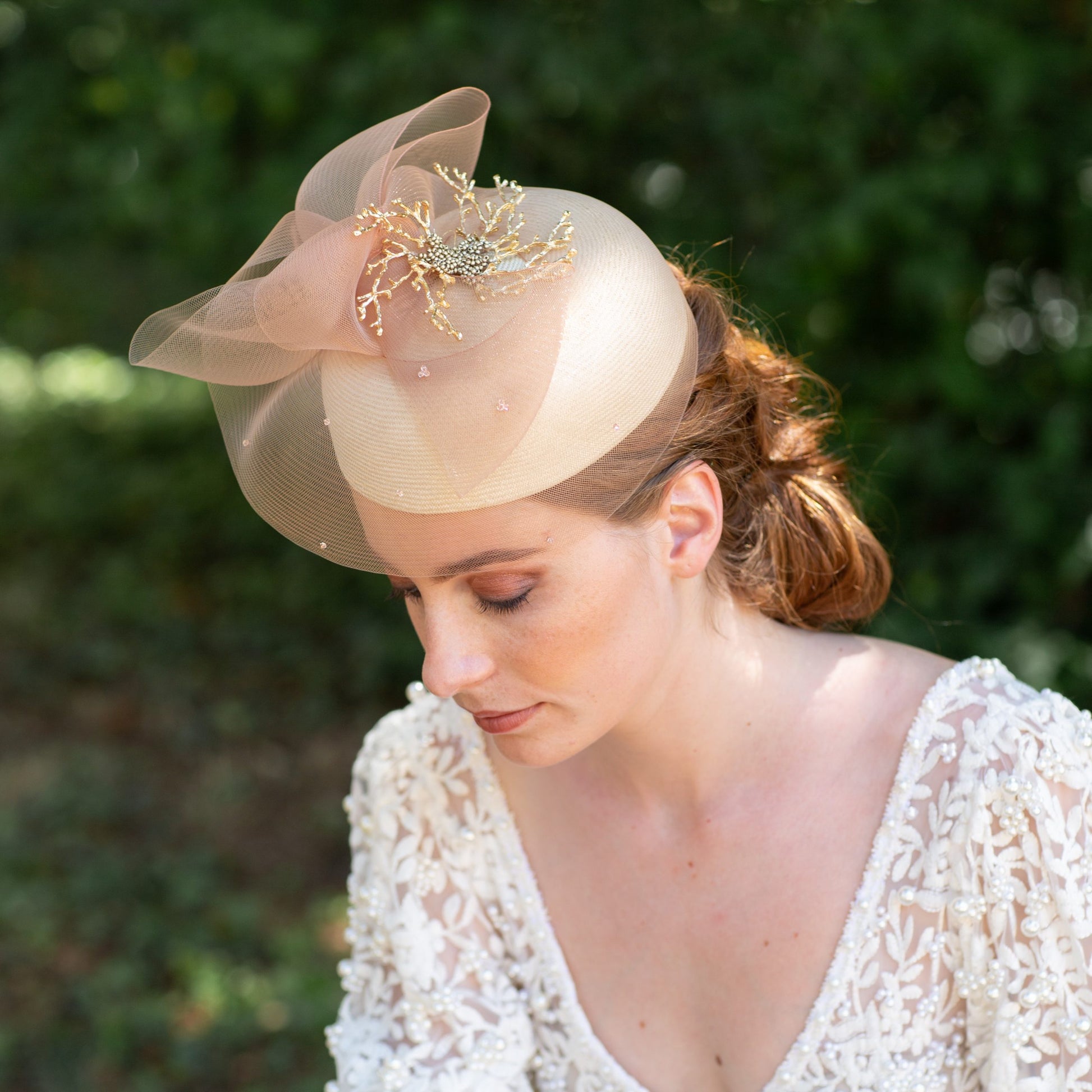 Este tocado está compuesto por un casquete de finisimo parasisal. Lo completa una lazada joya en crin color nude y un broche en tono dorado.  Las medidas del casquete son de 17 cm por 19, la talla es 57cm.